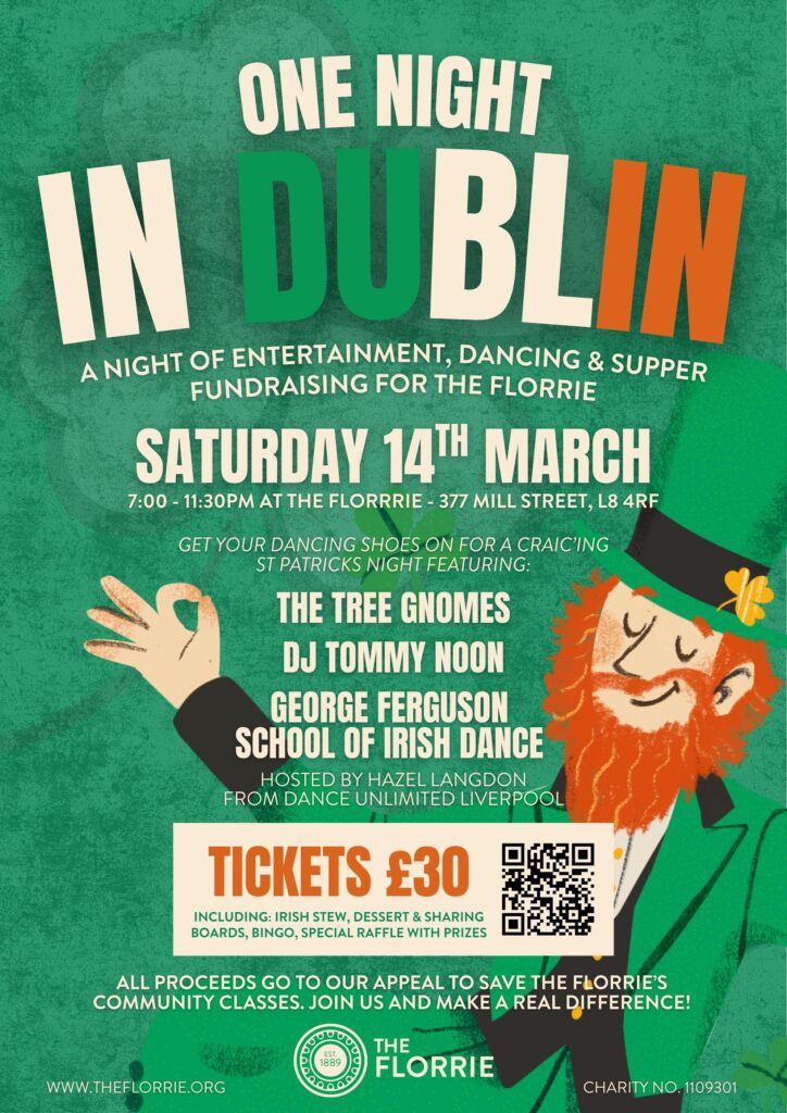 Tickets are £30 and include a hearty Irish stew, dessert, and sharing boards – perfect for a night of socialising and celebration. All proceeds go directly to support The Florrie’s community classes, ensuring this historic L8 hub continues to provide arts, culture, and learning opportunities for people across Liverpool.