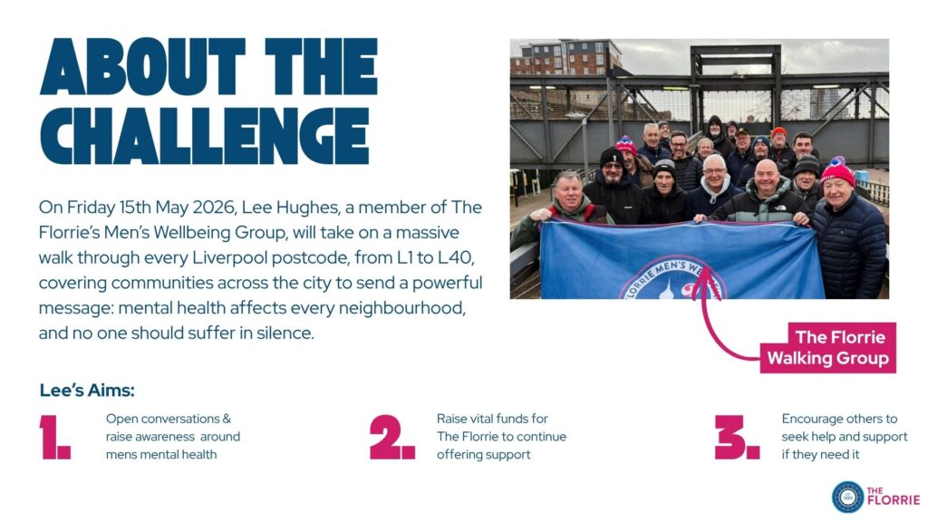 Lee will take on a massive walk through every Liverpool postcode, from L1 to L40, covering communities across the city to send a powerful message: mental health affects every neighbourhood, and no one should suffer in silence.